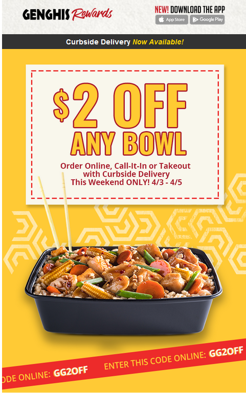 20% Off Genghis Grill Promo Code, Coupons (1 Active) 2022 Genghis Grill Promo Codes: Complete Timetable ; TUESDAY. 20% Off. Extra 20% Off Store-Wide ; DRPEPPER. $2 Off. Extra $2 Off (Any Bowl when You Order a Dr. Pepper).