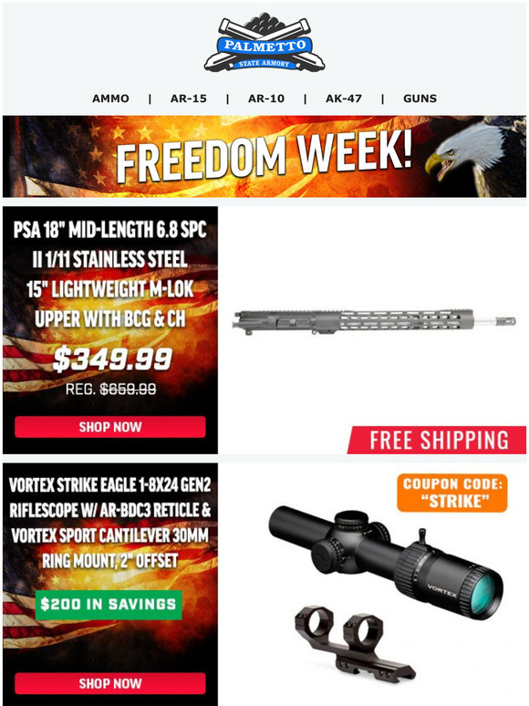 Free Shipping Deals | Palmetto State Armory PSA Free Shipping Deals. Check out Palmetto State Armory Free Shipping deals for some of your favorite products that ship absolutely free. You can find 9mm pistols, handgun/AR-15 combos, AR-15 rifles, ammo, AR-15 uppers, kits, and AR receivers. Guns Ammo AR Uppers & Kits AR Receivers. Guns. Ammo. AR Uppers & Kits. AR Receivers. View as Grid View List View. Items 1 …