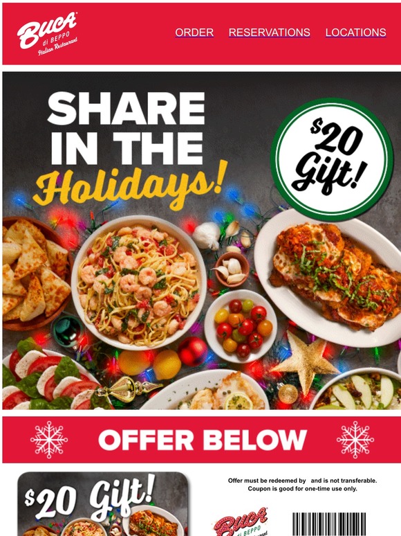 $25 OFF Buca Di Beppo Coupons & Promo Deals - Las Vegas, NV - FriendsEAT This weekly giveaway is $25 Gift Card that can be used at any restaurant in Las Vegas. To be eligible for the promotion review a businesses. You will be notified by email of your entry into giveaway. At 11:59pm on Sunday every week a popular reviewer is selected. Continental. Buca di beppo las vegas excalibur. Buca di beppo near me.