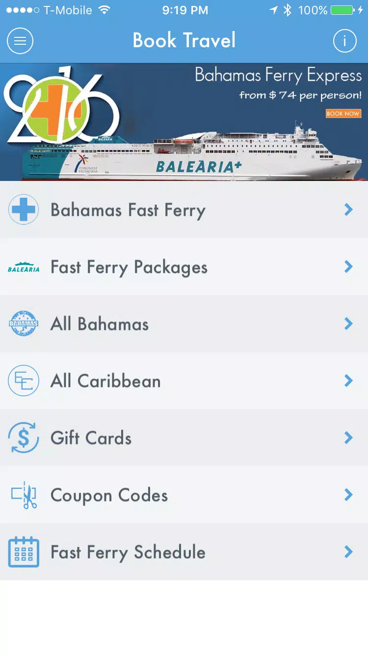 Book Now - Bahamas Ferries Select your departure (Sailing from) Select where you want to go (Sailing to) Click the Book Now button to specify more details about your voyage and confirm your reservation. Call our Ticket Office - Contact our ticket office at 242-323-2166 and a Bahamas Ferries Agent would be happy to assist you in making your reservation.